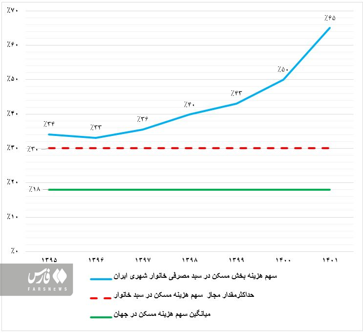 وی افزود: به عبارت دیگر ۳۵٫۵۲ درصد از مخارج خانوار مربوط به بخش مسکن بوده اما براساس گفتهی رئیس مرکز پژوهشهای مجلس در همایش الزامات و ساز و کارهای فنی اجتماعی و اقتصادی تحقق نهضت ملی مسکن، در سال ۱۴۰۰ سهم این بخش در سبد مصرفی خانواده شهری ایران به ۶۰ تا ۷۰ درصد افزایش یافته است.
