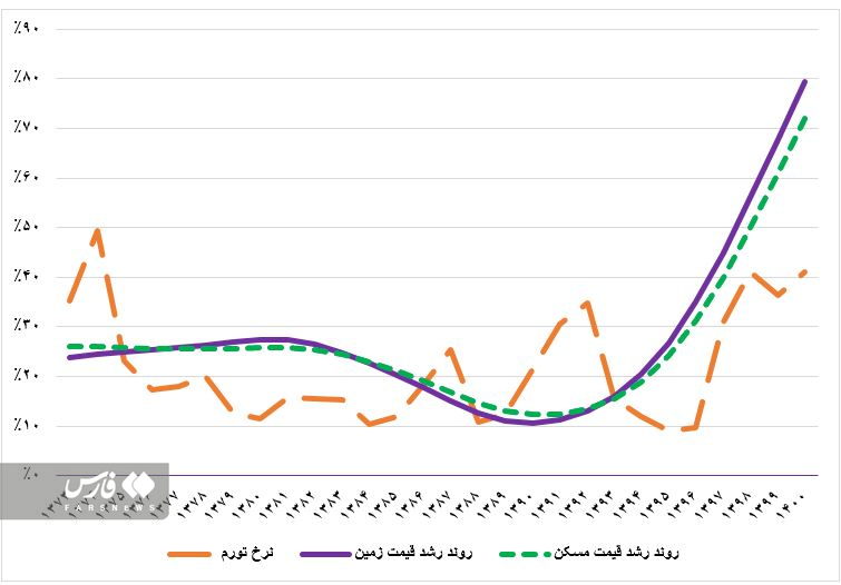 به طوریکه از سال ۱۳۷۵تا ۱۳۸۶، ۱۳۸۸ و از سال ۱۳۹۳ تا ۱۴۰۰ رشد قیمت زمین و مسکن بیشتر از نرخ تورم بوده است.