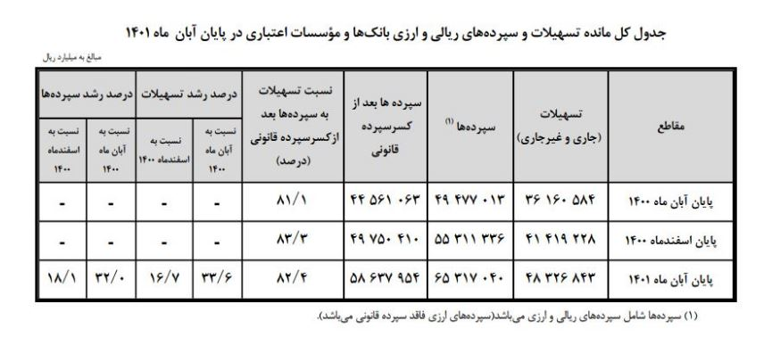 مانده کل سپردههای بانکی در پایان آبان ۱۴۰۱ بیش از ۶۵۳۱۷٫۰ هزار میلیارد ریال است که نسبت به مقطع مشابه سال قبل ۱۵۸۴۰٫۰ هزار میلیارد ریال (۳۲ درصد) و نسبت به پایان سال قبل معادل ۱۰۰۰۵٫۷ هزار میلیارد ریال (۱۸٫۱درصد) افزایش نشان میدهد.