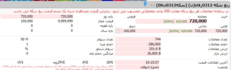 با پایان یافتن زمان معاملات، کشف قیمت انجام شده و قیمت هر واحد هر ربع سکه ۷۲۰ هزار ریال به فروش رسیده است. با این تفاسیر، قیمت سکه در بورس کالا ۷ میلیون و ۲۰۰ هزار تومان کشف شده است که ۵۰۰ هزار تومان ارزانتر از بازار آزاد معامله شده است.