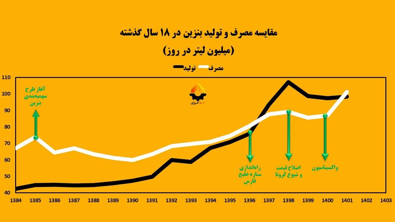 - شیوع کرونا در اواخر سال ۹۸ و اعمال سیاستهای فاصلهگذاری اجتماعی نیز بر کاهش مصرف بنزین در کشور اثرگذار بود.