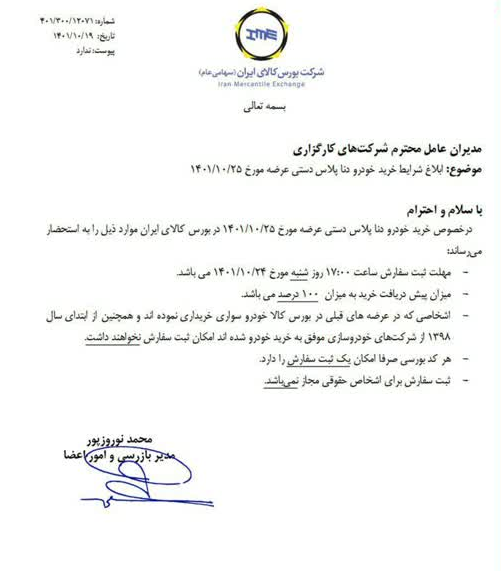 گروه صنعتی ایران خودرو تعداد عرضه خودرو دناپلاس برای روز آینده در بورس کالا را به ۱۰ هزار دستگاه افزایش داد.