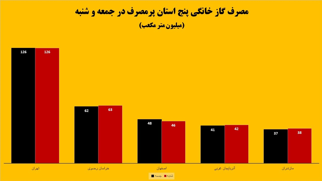 طبق آمار شرکت ملی گاز، میزان مصرف گاز پنج استان پرمصرف ایران شامل تهران، خراسان رضوی، اصفهان، آذربایجان غربی و مازندران در روزهای جمعه هفته گذشته و شنبه هفته جاری آورده شده است.