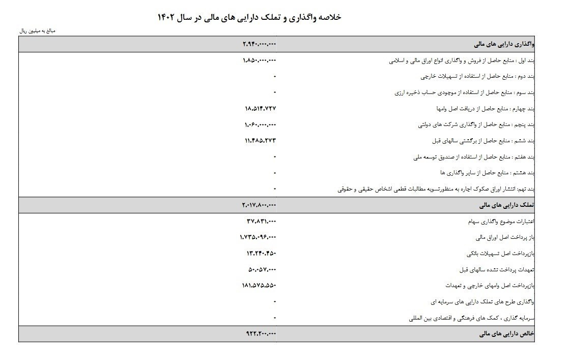 بر اساس ماده واحده لایحه بودجه سال ۱۴۰۲ کل کشور از حیث منابع و مصارف افزون بر ۵۲ میلیون و ۶۱۶ هزار و ۹۶۵ میلیارد ریال است. دولت در لایحه بودجه ۱۴۰۲، درنظر دارد از واگذاری دارایی های مالی ۲۸۸ هزار میلیارد تومان درآمد کسب کند.